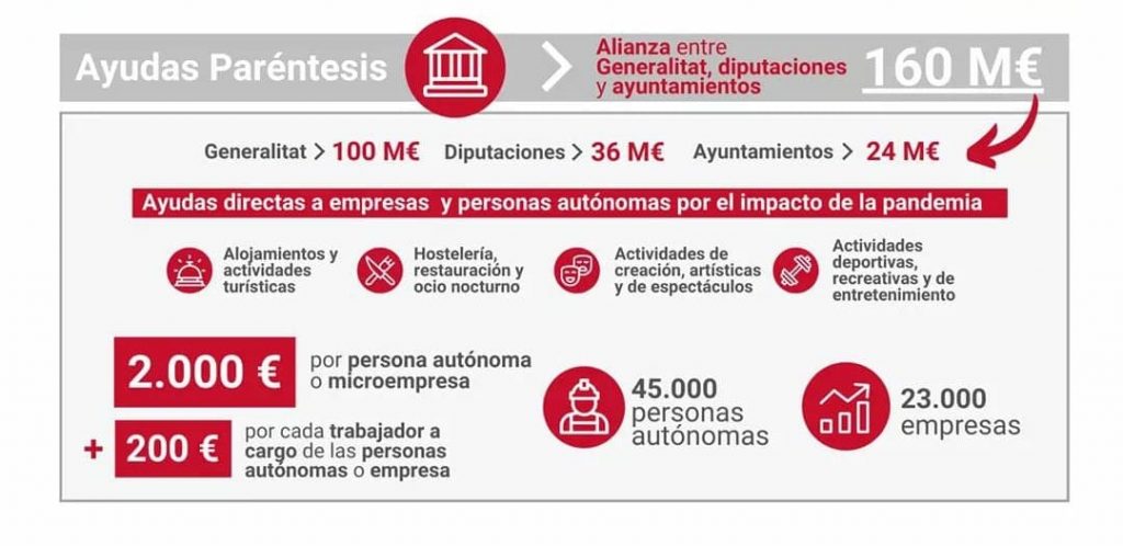 El presidente de la Generalitat Valenciana, Ximo Puig, explicó que las ayudas Paréntesis tendrán un fondo de 160 millones de euros, que repartirán entre 100 millones de la GVA, 36 millones aportados por las diputaciones y 24 millones de los ayuntamientos. Según se ha anunciado su gestión la realizarán los ayuntamientos, que durante un plazo de 15 días desde que se publique el decreto Ley podrán presentar su participación.